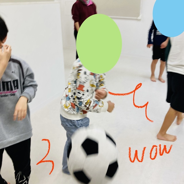 通常のドッジボールとは異なり、ボールが当たったら相手チームに移動、それを繰り返していき、最後にチームの人数が多い方が勝ち!という活動です。